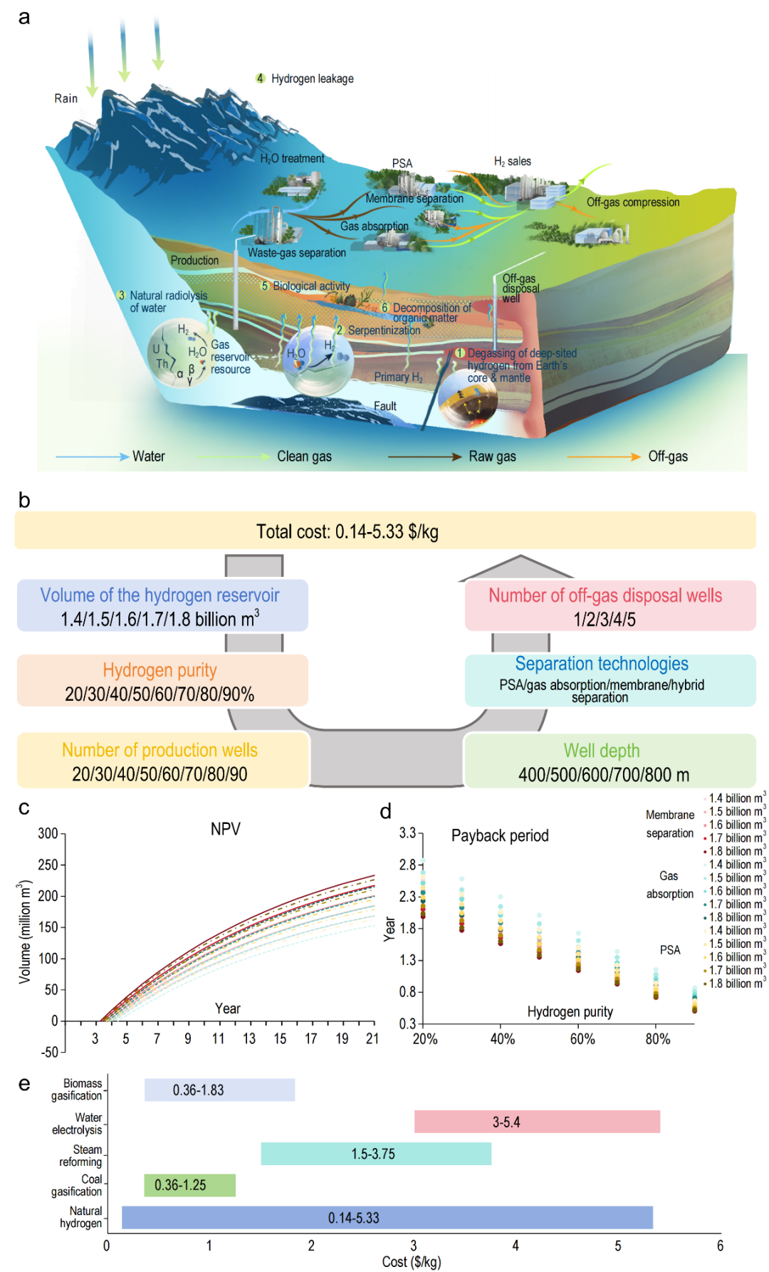 与其它制氢技术对比显示,天然氢的成本显著低于煤制氢(0.36–1.25美元/公斤)、天然气重整制氢(1.50–3.75美元/公斤),甚至低于部分生物质气化制氢(0.36–1.83美元/公斤)和核能电解水制氢(3.00–5.40美元/公斤)。研究指出,纯度超过60%的天然氢开发项目具备显著市场竞争力和经济可行性。该研究为天然氢资源的勘探与开发提供了重要的理论依据和技术支撑,对未来氢能产业的低碳转型具有积极推动作用。